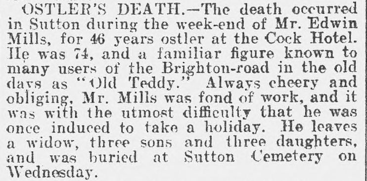 Mary continued to live in Belmont until her death in 1957. Mary’s death was reported in the local newspaper. The below is from Sutton and Epsom Advertiser, 2nd January 1958.